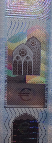 En el caso de los billetes de euro, el holograma muestra el valor del billete y una puerta o una ventana.