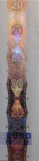 En los billetes modernos, se incluyen hologramas en forma de banda o parche. Se pueden definir como una imagen fotográfica tridimensional, que cambia según el ángulo de incidencia de la luz que llega a ella.